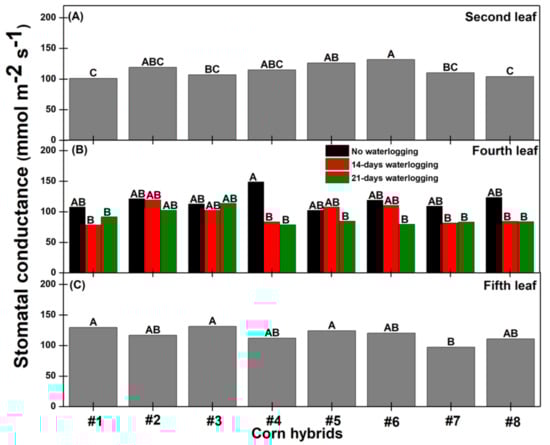 Stomatal conductance of the second (A), fourth (B), and fifth (C) leaves of corn plants among different hybrids. Same letters on bars indicate means do not differ significantly (p < 0.10) based on Fisher’s least significant difference test. Means are compared separately for each leaf. Data was averaged over waterlogging duration for second and fifth leaves due to absence of significant effect of waterlogging duration and interaction between hybrids as well as no significant effect of waterlogging duration on stomatal conductance.