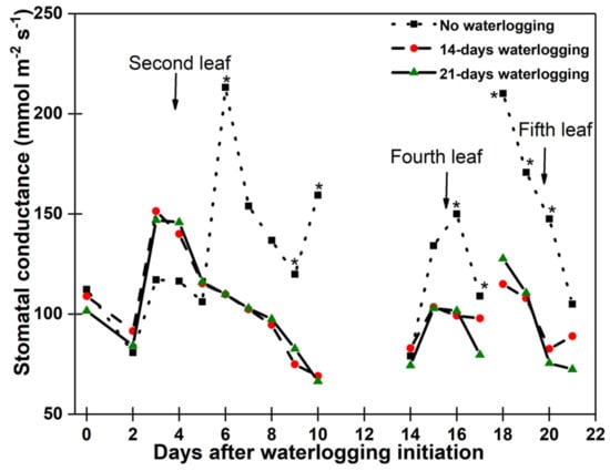 Changes in stomatal conductance of second, fourth, and fifth corn leaves due to waterlogging duration with time. * Significant differences between means among waterlogging duration at p < 0.1. Data was averaged over hybrids to show interaction of different waterlogging duration with time. Days after waterlogging in the x-axis were obtained from the waterlogged treatments.