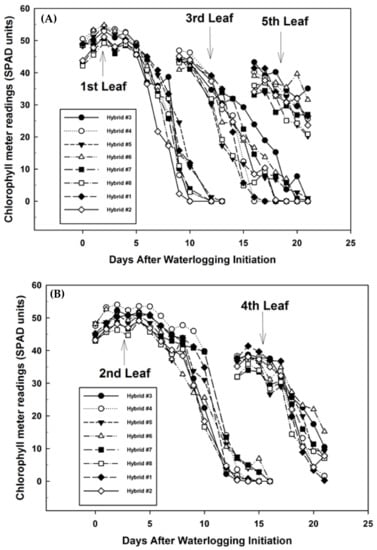 Changes in chlorophyll meter readings for first, third, and fifth leaf (A) and for second and fourth leaf (B) among different corn hybrids as affected by days of waterlogging in 21-day waterlogging treatments.