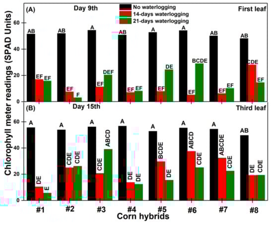 Chlorophyll meter readings for the first (A) and third (B) leaves of corn plants as affected by waterlogging duration among different hybrids. Same letters on bars indicate means do not differ significantly (p < 0.10) based on Fisher’s least significant difference test.