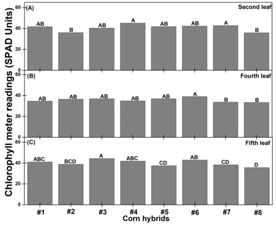 Chlorophyll meter readings on second (A), fourth (B), and fifth (C) leaves of corn plants among different hybrids. Same letters on bars indicate means do not differ significantly (p < 0.10) based on Fisher’s least significant difference test. Data was averaged over waterlogging duration due to absence of significant interaction between waterlogging duration and hybrids as well as no significant effect of waterlogging duration.
