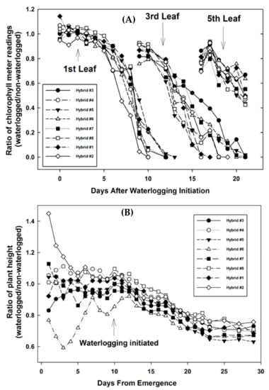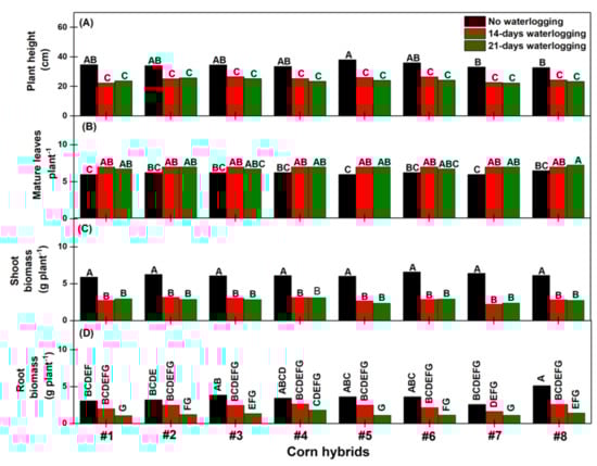 No differences were found for number of mature leaves due to waterlogging for Hybrids #2, #3, #4, and #6 (Figure 10B). Hybrids #1, #5, and #7 under 14-day and 21-day waterlogged conditions had one extra mature leaf by the time of harvest compared to nonwaterlogged conditions. Hybrid #8 had one extra mature leaf in 21-day waterlogged treatments than in the nonwaterlogged conditions. In contrast, Grzesiak et al. [] found that number of leaves for two corn hybrids was reduced by 35 or 77 days of waterlogging treatment compared to nonwaterlogged treatments.