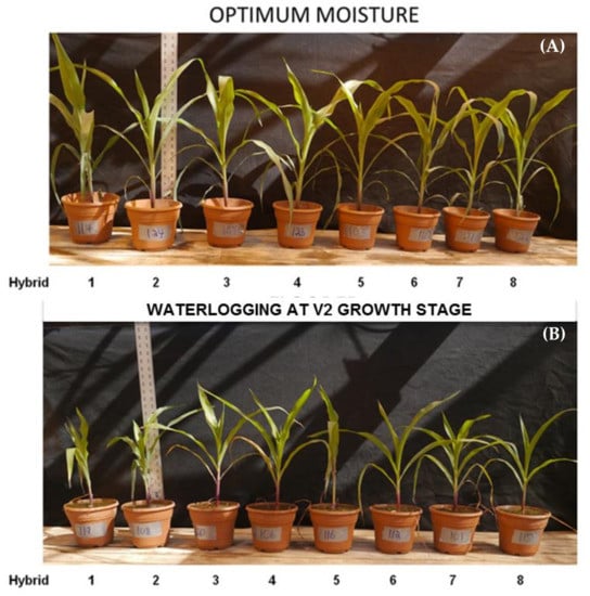 Several studies have shown that significant genetic differences occurred in the response of corn plants to soil waterlogging stress [,,]. Such variability in corn plant responses to soil waterlogging can be utilized to identify and develop corn hybrids tolerant to waterlogging, especially for poorly drained soils in Missouri. Identification and development of corn hybrids that can withstand waterlogging stress is one approach to reduce production losses caused by waterlogging. Therefore, the objectives of this study were to screen and identify corn hybrids for waterlogging tolerance in a controlled environment.