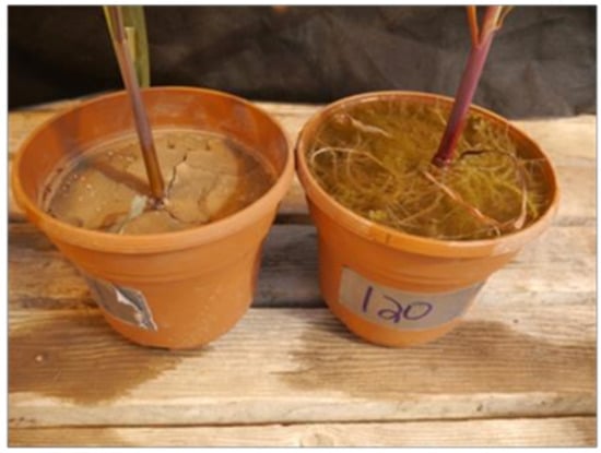 No significant differences were obtained for root biomass due to waterlogging for Hybrids #4 and #7 (Figure 10D). All other hybrids showed significant reductions in root biomass due to 21-day waterlogging compared to nonwaterlogged treatments. Hybrid #8 under nonwaterlogged conditions had 2.52 g higher root biomass than in 14-day waterlogging treatments. In a greenhouse pot study, Wang, Liu, Li, and Chen [] found that the belowground biomass and total biomass of corn seedlings were 52 and 34% higher, respectively, in nonflooded compared to six-day flooding conditions at the V2 growth stage. Hypoxic or anoxic soil conditions reduced root growth and biomass accumulation under waterlogged conditions. Root biomass in 14-day waterlogged pots was not increased compared to 21-day waterlogged pots, which might be due to insufficient recovery time between waterlogging end and plant harvest. Lizaso and Ritchie [] reported that root growth of corn plants waterlogged for 4 or 8 days increased rapidly about 10 days after the waterlogging treatments ended. Another study by Lizaso et al. [] reported that root biomass reductions due to waterlogging of corn varieties were greater than for shoot biomass, and after the excess water in waterlogged pots was drained, plants invested more biomass into roots to reconstruct their root systems. Some of the corn hybrids exhibited a proliferation of surface roots as a response and possible tolerance mechanism to the extended soil saturation (Figure 11).