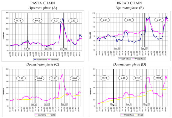 The Kejriwal and Perron procedure [20] identifies for both the upstream and downstream side of the chain three breaks and four regimes. In the upstream phase (farm–wholesale) the price transmission elasticity appears generally high especially when the durum wheat prices grew (first and third regimes). In the period between Oct. 2005 and Mar. 2008 (third regime), when prices recorded a very strong rise, the influence of durum wheat price on the semolina price reaches values of 1.01. To the contrary, during phases with decreasing prices—that is in the second and fourth periods—transmission price elasticities are lower. More specifically, when durum wheat price decreased by 1% the semolina prices decreased by 0.42% and 0.53%, respectively. This finding suggests the presence of asymmetry in the transmission of price changes.