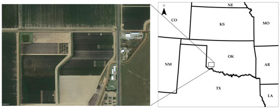 This study was conducted at the Oklahoma State University’s Southwest Research and Extension Center, near Altus, Oklahoma (Figure 1), during three years from 2015 to 2017. The area is within the Lugert-Altus Irrigation District, which delivers water to over 18,000 ha of irrigated land through a 435 km system of open canals [7]. The irrigation district draws its water from Lake Altus-Lugert, with a capacity of about 120 million m3 [7,13].