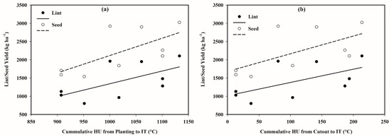 The linear regression models revealed weak positive relationships between cotton lint/seed yield and cumulative HUs during planting-IT and cutout-IT periods (Figure 2), with coefficients of determinations ranging from 0.34 to 0.45. However, the only regression model that was statistically significant was the one between seed yield and HUs during planting-IT (p = 0.047). Peng et al. [34] found that cotton yield was highly correlated to accumulated HUs when water availability was not a limiting factor. They also highlighted that water supply can alter the yield-HU relationship and observed no significant correlation between lint yield and HU under water stress in the Southern High Plains of Texas.