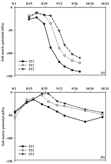 Thomson and Fisher [35] analyzed the relationship between root zone SMP and cotton yield in Mississippi Delta and reported that cotton should be irrigated at SMP of −60 kPa. The soil type of their experiment was clay in the Sharkey series, which is similar to the soil type in the present study. Assuming that their irrigation trigger point applies to this study, no irrigation was required after IT1 in 2016 since root zone SMP did not drop below this limit. In other words, the additional irrigations applied in IT2 and IT3 did not help with removing any water stress. This explains the lack of any significant difference in measured parameters among IT treatments in 2016. In contrast, soil water content was depleted well beyond the −60 kPa threshold in both 2015 and 2017, resulting in a larger response to IT treatments.