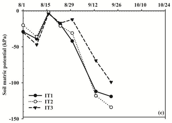 Treatment averages of soil matric potential in (a) 2015, (b) 2016 and (c) 2017.