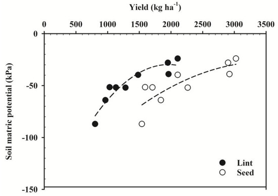 Plotting lint and seed yields against the average late-season SMP revealed strong relationships that had the form of quadratic equations with coefficients of determination (R2) of 0.89 and 0.67, respectively (Figure 4). The coefficients of developed quadratic equations are provided in Table 9. According to these relationships, lint and seed yields plateaued around average SMP of −30 kPa, which is close to the field capacity limit for most soils. Maintaining SMP at higher levels than −30 kPa would not result in improved cotton performance. Similar relationships have been reported between cotton yield and applied irrigation water in Turkey [36] and Texas [37] where cotton yield increased with applied water to a certain limit and then decreased if more water was applied, especially during late-season.