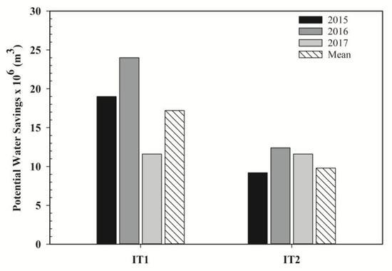 The potential water savings from adoption of IT and IT2 treatments can be extrapolated to the entire Lugert-Altus Irrigation District, using water release data from Lake Altus-Lugert. Total water releases were 65, 73, and 46 million m3 in 2015, 2016, and 2017, respectively [39]. The water delivery to the district is usually terminated around the end of August [5], which coincide with the IT3 timing in this study. Thus, the IT3 treatment was used as the benchmark for estimating the potential water savings across the district in each study year and on average. The estimated water savings ranged from 11.6 to 24.0 million m3 for IT1 and from 9.2 to 12.4 million m3 for IT2 during the study years. The average potential water savings for IT1 was 17.2 million m3, about 1.75 times larger than the average saving of 9.8 million m3 for IT2 (Figure 5).