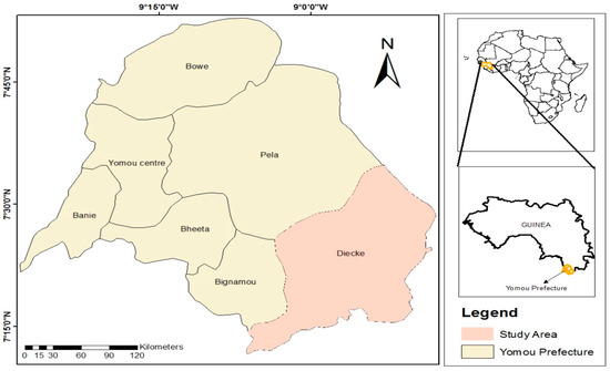 This study was carried out in Diecke sub-prefecture (Figure 1), one of the seven sub-prefectures of the Yomou prefecture located in the N’Zerekore Administrative Region. Yomou covers an area of 3920 km2 and has an estimated population of 114,371 people. It is one of the few areas in Western Africa that still contains extensive areas of tropical rainforest. Its climate can be classified as sub-equatorial, with the mean temperature ranging from 18 °C in December to 22 °C in March and the mean annual rainfall is just over 2000 mm. The wet season spans nine months and there is relatively high humidity throughout the year [23].