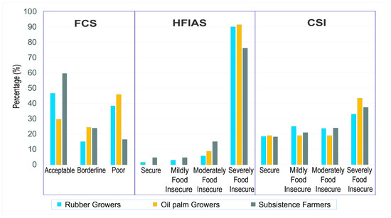 Overall the food security status of study groups varies among the different metrics (Table 3). Both oil palm and rubber smallholders have significantly lower levels of diet diversity (FCS) than subsistence farmers (Table 3). On the other hand, industrial crop smallholders have lower levels of perceptions of hunger (HFIAS) compared to subsistence farmers, with oil palm growers having significantly better HFIAS levels than the other study groups. When it comes to coping behaviors in periods of food scarcity (e.g., CSI) there are mixed results between groups. In particular group differences are not statistically significant (Table 3). When looking at the distribution patterns across indicator thresholds (Table S1, Figure 2), subsistence farmers have the lowest proportion of respondents in the highest food insecurity thresholds for FCS and HFIAS and the second lowest for CSI (only behind rubber growers). Oil palm growers consistently have the highest proportion of respondents in the highest food insecurity thresholds for all indicators.