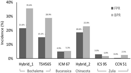Random collected pods with FPR and BPR from the different plantations sites were analyzed to establish the agro-ecological characteristics of the evaluated areas. Incidence of FPR in the four sites ranged from 0.4 to 21.6%, while BPR ranged from 1.8 to 35.6%. The most susceptible biological materials, to both FPR and BPR, were Hybrid_1 and Hybrid_2, followed by clone TSH 565. The lowest incidence percentages were observed in clones CCN 51, ICS 95, and ICM 67 (Figure 1).