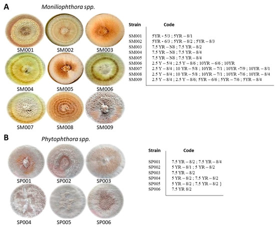 Macroscopic growth and Munsell Colors of (A) Moniliophthora (SM01-SM009) and (B) Phytophthora (SP001-SM006) in agar. CEC-PDA, cocoa pod cortex extract and chloramphenicol.
