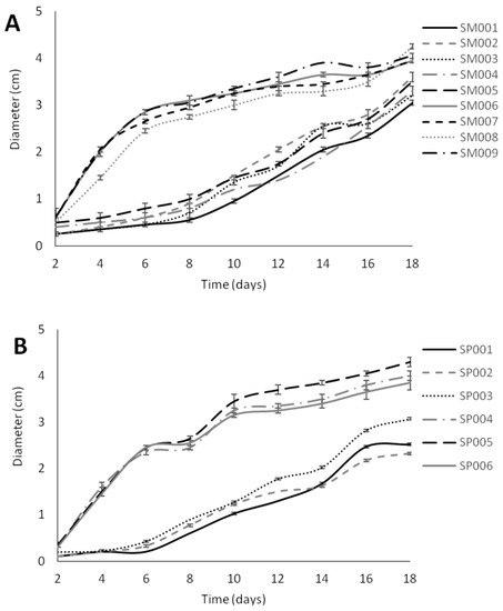 Figure 3 shows the growth rate measurements observed every two days over an 18-day period for all Moniliophthora and Phytophthora isolates. When analyzing the results obtained for Moniliophthora spp. isolates, two groups can be clearly distinguished. The first group (i.e., SM001 to SM005) displayed lower growth rates than the second group (i.e., SM006 to SM009). Isolates SM006 to SM009 were observed to be the longest ones, reaching diameters between 4.0 and 4.5 cm after 18 days of incubation. The first group was isolated from pods coming from Hybrid_2, clones ICM 67, CCN51, ICS 95, and TSH 656, while isolates SM0006 to SM009 were all obtained from Hybrid_1.