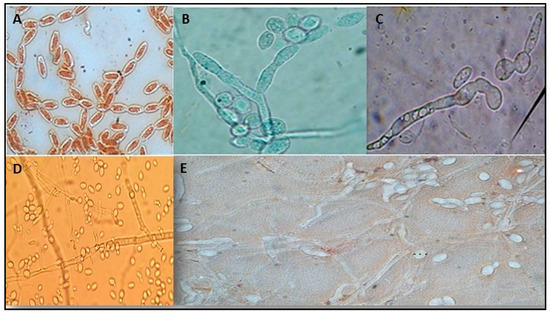 Reproductive structures of isolated Moniliophthora roreri (100×). (A) Catenulate spores. (B,C) Basipetally maturing spores. (D) Globose and ellipsoid spores. (E) Hyaline hyphae and ellipsoid spores.