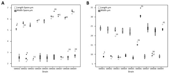 Average size of individual and chain spores of Moniliophthora roreri. (A) Spore size and (B) length and width.