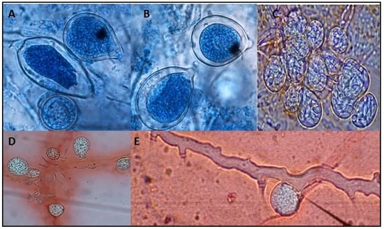 Reproductive structures of isolated Phytophtora palmivora (40×). (A) Ovoid sporangia. (B) Papillate zoosporangia with short pedicels. (C,D) Zoosporangia containing mobile zoospores. (E) Zoosporangium sprouting from a coenocytic hypha.