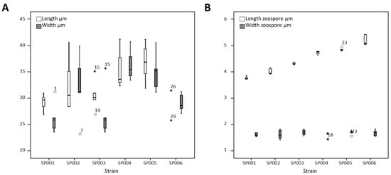 Average size of (A) sporangia and (B) zoospores of Phytophtora palmivora.