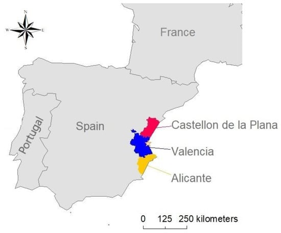 The Valencian community is located along the Mediterranean Sea coast on the eastern side of the Iberian Peninsula (Figure 1), and extends along a coastal line towards the mountains, presenting a variety of representative Mediterranean environmental conditions. The Valencian Community is divided into three provinces, Valencia is the capital city and the third largest metropolitan area in Spain (indicated with a star in Figure 1), Castellón de la Plana, and Alicante. The area has 518 km of coastline on the Mediterranean Sea, covering a total area of 23,255 km2, with 4.5 million inhabitants and 534 municipalities. The entire region can be classified a Mediterranean climate regime, even if the western area has a more continental climate with less humidity and broader diurnal swings.