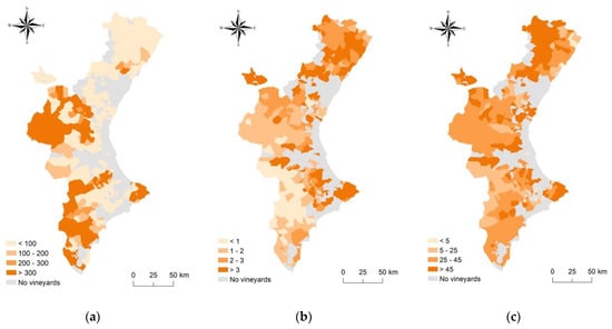 In 2017, about 71,000 ha were devoted to wine production in the Valencian Community. Three basic indicators are represented in maps (Figure 2):