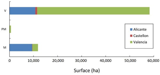 Type of wine cultivated (winemaking processes: ‘V’; table wine: ‘M’; mother vine: ‘PM’) in each province of the Valencian Community.