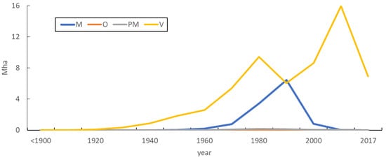As well as providing a source of income for the agricultural economy, vineyards are a characteristic landscape in the Valencian community. Following a 10-year historical series, they have experienced a considerable expansion in the 1960s and 1970s (Figure 4). About 23% of the existing vineyards were specially planted in the 2000s. Mainly vineyards are dedicated to winemaking, while the current vineyards used only to make table wine were planted mostly among the 1970s and 1990s. Consequently, the largest area for table wine vineyards was established specifically in those years, offering more commercial wines in the economic market. Figure 4 reports a current assessment of vineyards (in 2017), following their planting year (x-axis) and surface areas in the Valencian community (y-axis, in mega hectares) according to each final wine product. Other uses of the wine have been reported with other (‘O’) but have a minimal relevance as can be seen from the Figure 4.