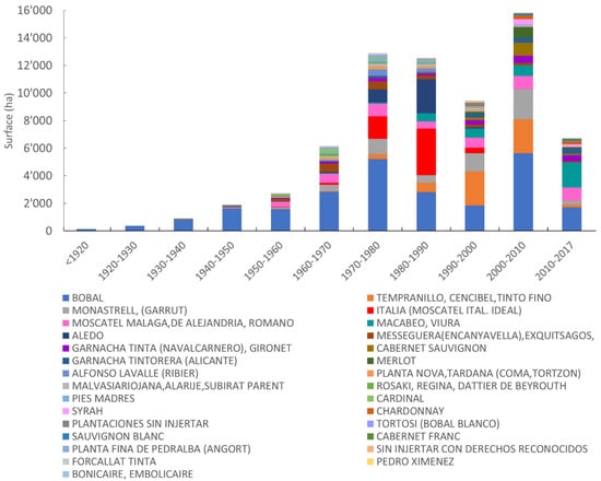 In line with the spatio-temporal evolution of vineyards, the most successful types of wine were also detected. Considering the vineyards that today cover an area greater than 100 ha at a regional scale, the most characteristic wines are: Macabeo, Moscatel Malaga-De Alejandria-Romano, Italian Moscatel, Monastrell (Garrut), Tempranillo and Bobal. Considering 10-year intervals, planting of vineyards has mainly occurred in two decades: 1970–1980 and 2000–2010 (Figure 6).