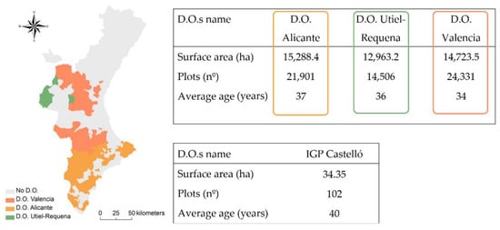 The available data from the Agrarian Studies Service of the Generalitat Valenciana were collected and processed. As a snapshot of today’s situation, data refer to all existing vineyard plots in the Valencian community. Therefore, it is not possible to study how many vineyards have been lost over time, but the present study explores how long the current vineyards (2017) have enriched the rural landscape in the region, considering the vineyard’s age structure from a demographic point of view. Data describe all the rural plots intended for viticulture indicating the type of wine cultivated, the year in which each vineyard was planted, if each vineyard is labeled as protected designation of origin, the surface area occupied by each plot, and in which municipality it falls.