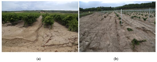 From the environmental point of view, concerns about the negative impact on soil quality, as well as the occurrence land and water losses due to non-sustainable management of vineyards have frequently emerged [32]. Vineyards produce the highest soil and water losses [27,28,29,30]. For instance, other Mediterranean orchards, e.g., persimmon [33], citrus [34,35], olive [9,36,37], apricots, [38] and avocado, [39] bring more sediment and water than neighboring natural areas [3]. Vineyards are a tree crop associated with environmental vulnerability [27,28,29,30,40] due to their lack of leaf cover during the winter and low plant cover in summertime [3,30,41,42,43,44,45,46,47]. Generally, the main driving factors of soil erosion in vineyards are: (i) lack of vegetation; (ii) high slope angles; (iii) weak soil aggregate permanency; (iv) risky rainfall events, permitting rapid raindrops access to the soil surface; (v) intensive tillage; (vi) applied chemicals that increase soil contamination; and, (vii) nutrient impoverishment due to the lack of organic fertilization [48,49,50].
