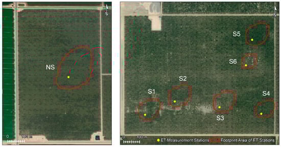 Location of the ET measuring stations and footprint areas in the non-saline (NS) orchard (left) and saline-sodic affected (S) orchard (right).