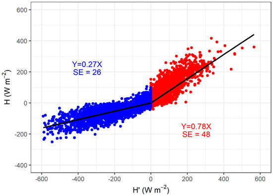 Figure 2 shows an example of the scatter of the H versus H′ data obtained during the entire 2016 season in the non-saline orchard. Alpha calibrations were calculated separately for unstable conditions (upward fluxes), represented by positive H, and for stable conditions (downward fluxes), represented by negative H. It is well known that unstable conditions enhance turbulence with respect to stable ones, so separate calibration is common in literature [41,45,46].