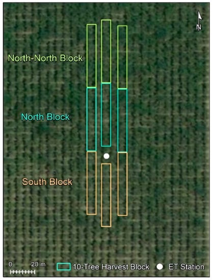 The nut yield was measured at the non-saline and saline/sodic sites during the harvesting operations, from blocks of trees (south, central, and north) located within the footprint areas of each ET station (Figure 3), each consisting of 10 female trees. The trees immediately north and south of the ET station were not harvested to avoid the risks of shake-harvest damaging field instrumentation. The trees were mechanically harvested, and the resulting nuts were collected in bins and weighed.