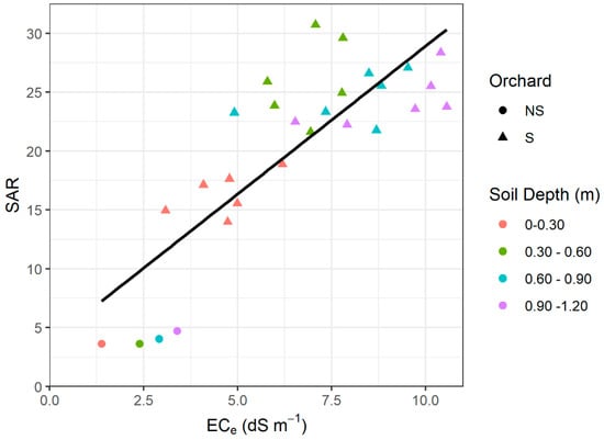 Relation between ECe and SAR at different soil sampling depths (between 0 and 1.20 m) for the study orchards. Each point in the graph represents the average of 12 soil samples at each soil depth for the non-saline (NS) and the saline-sodic (S) orchards. The black solid line indicates the linear regression for the entire dataset. The parameters of the linear equation are: a = 1.5, b = 3.8; ; p value < 0.001.