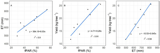 Relations found across all study sites between: (A) mean fPAR (averaged over the 2016 and 2017 seasons) and cumulative ETa (averaged over the 2016 and 2017 seasons from May 25 to October 10); (B) fPAR and averaged fresh nut yield; (C) cumulative ETa and averaged fresh nut yield.