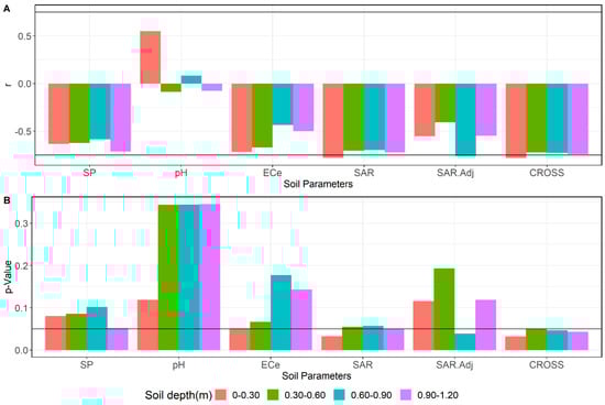 Results from statistical analysis involving correlation tests. The top graph (A) illustrates the correlations between RPR and different soil parameters for soil depths of 0–1.20 m with significance factors of r; the bottom graph (B) indicates the p-value obtained by the Student T-test. The black solid line represents the significance thresholds for r = 0.75 and p-value = 0.05. SP = saturation percentage (%); ECe = electrical conductivity (; = sodium adsorption ratio; = adjusted ; = cation ratio of soil structural stability.