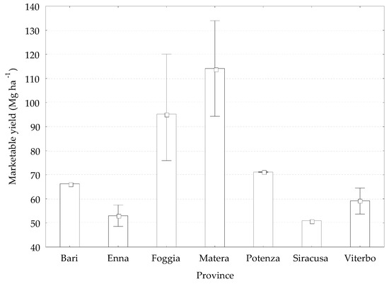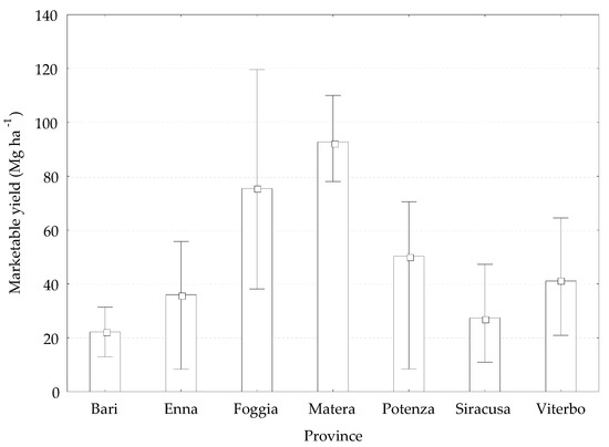 Marketable yield (Mg fresh weight ha−1) in the different provinces under DI, F (6;33) = 7.1298; p = 0.00006. Boxes represent mean values, whiskers represent Min–Max interval.