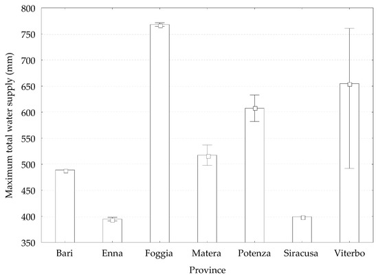 Total water supply (mm) under full irrigation in the different provinces. Boxes represent mean values, whiskers represent Min–Max interval.