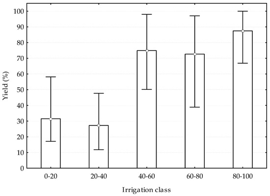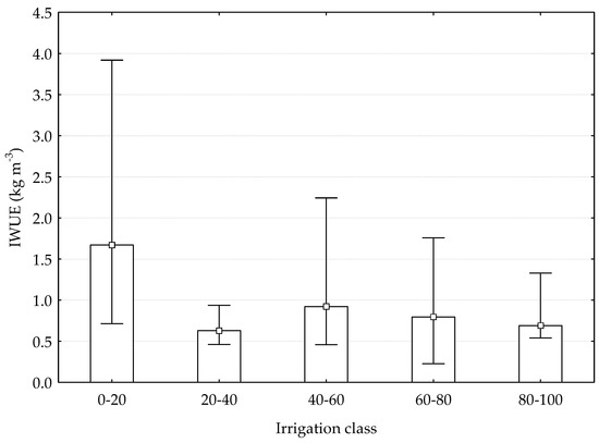 Irrigation water use efficiency (IWUE in kg dry weight m−3) was weakly significantly different (p = 0.0683) among irrigation classes (Figure 8). Average IWUE was significantly higher only in 0–20 irrigation class (1.67 kg m−3) compared to the other classes.