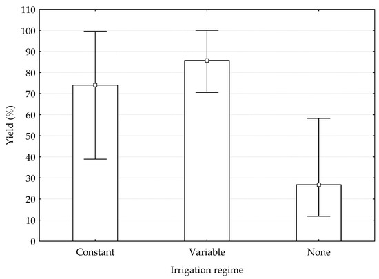 Average yields (%) significantly differed among irrigation regimes (p = 0.0000). As expected, yields (Figure 4) were significantly lower with none irrigation excluding rainfall during the crop cycle (26.8%), and did not differ between constant and variable regimes with the regulated deficit irrigation (RDI) but were lower under constant irrigation (74.0%) in comparison with RDI (85.7%).