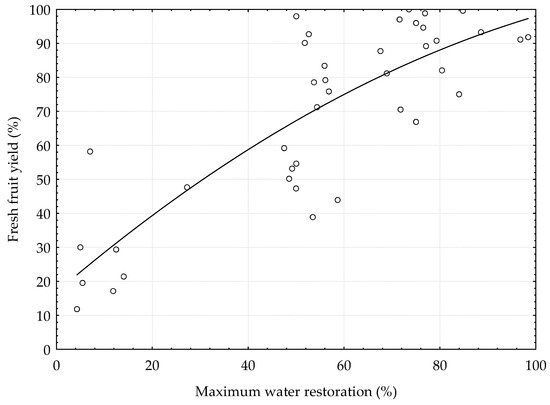 Tomato fresh fruit yield (%) as a function of maximum water restoration (%).