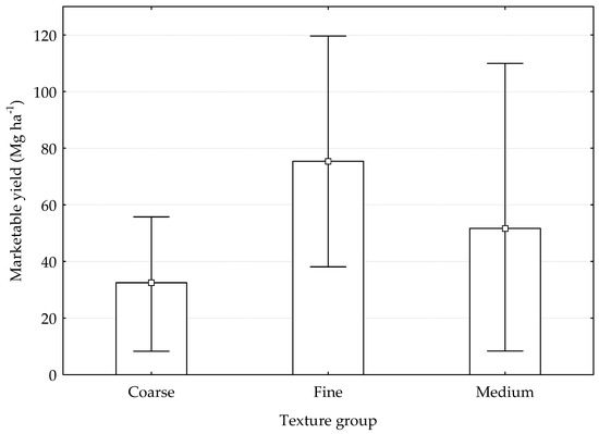 Marketable yield (Mg fresh weight ha−1) under DI based on soil texture groups according to United States Department of Agriculture (USDA), F (2;37) = 6.1615; p = 0.0049. Boxes represent mean values, whiskers represent Min–Max interval.