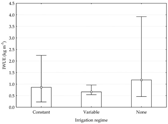 In relation to irrigation regimes (Figure 9), IWUE was not significantly different (p = 0.2366). IWUE was higher with no irrigation (1.18 kg m−3) and decreased with constant and variable irrigation regimes (0.86 and 0.66 kg m−3, respectively).