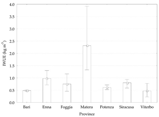 IWUE significantly differed among the provinces (p = 0.0000) where the field experiments were conducted (Figure 10). In detail, average IWUE was significantly lower at Viterbo, Bari, Potenza, Foggia Siracusa, and Enna (0.47, 0.49, 0.61, 0.75, 0.80, and 0.98 kg m−3, respectively) compared to Matera (2.31 kg m−3). Results for Matera are in agreement with the low decreases observed in marketable yields.