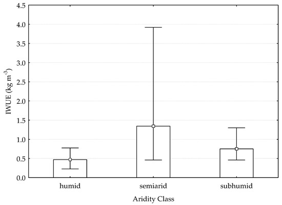 Irrigation Water Use Efficiency (IWUE) (kg dry weight m−3) based on the aridity classes [37], F (2;37) = 5.3391; p = 0.0092. Boxes represent mean values, whiskers represent Min–Max interval.