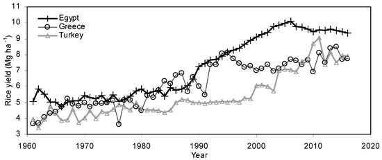 The rice yield trends for Egypt, Greece, and Turkey for the period 1961–2016 [4].