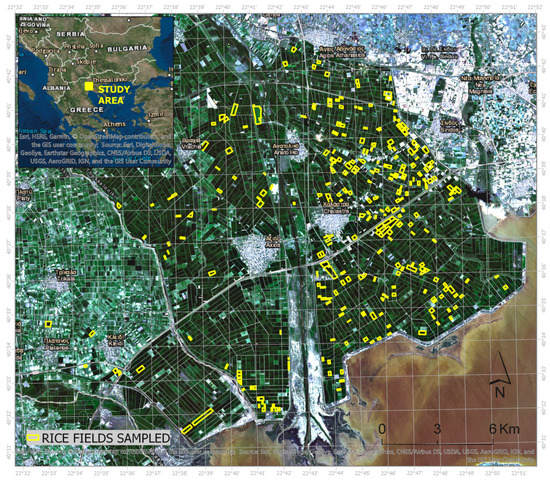 From the overall study area, dispersed pilot rice fields with a total coverage of 753 ha (about ~4% of the area of rice fields) were used in order to perform soil samplings. The pilot rice fields belong to 15 different farmers (Figure 2).