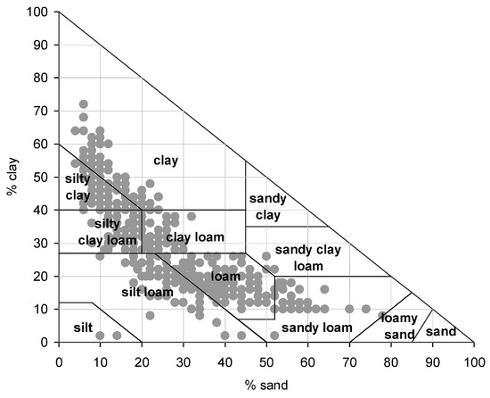 The soil samples were mechanically crumbled, air-dried, sieved with a 2-mm sieve, and prepared for assessing soil texture through particle size analysis with the hydrometer (or Bouyoucos) method [41]. The distribution of samples based on the 12 USDA soil texture classes is given in Figure 4. Additional measurements included: percent of organic matter with the wet digestion method [42], percent of CaCO3 with the back titration method [43], pH measured in saturated paste, and electrical conductivity (EC) measured in a soil saturation extract. Nitrate-nitrogen was measured using 2M KCl [44], available phosphorus according to the Olsen method [45], exchangeable Ca, K, and Mg with ammonium acetate at pH = 7.0 [46], Cu, Mn, Fe, and Zn measured using DTPA [47], and extractable boron with the azomethine-H method [48].