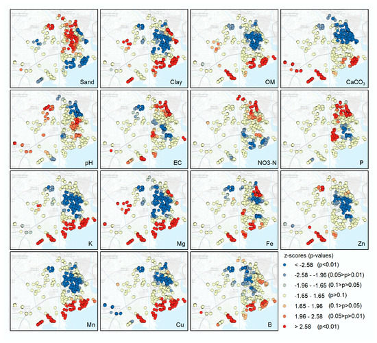 In order to assess the spatial patterns of soil properties in the study area, the statistic of spatial autocorrelation was applied for each soil parameter measured in the laboratory. The Inversed Euclidean Distance method was applied for the tests, revealing that all measured soil properties were significantly clustered (i.e., similar values were found close to each other). These results indicated that the sampling scheme was dense enough to avoid biases due to possible rapid changes in soil properties’ values or unexpected discontinuities. Spatial stationarity [68,69] was also checked for all soil properties using global trend tools and was found to be slightly positive over the study area, as expected. Spatial stationarity is defined as the degree of similarity in the way measured variables are autocorrelated throughout the study area; the most non-stationary properties were found to be soil texture, EC, Zn, and Mn (further details would be outside the scope of this research). Furthermore, the clusters were spatially visualized with Hot Spot Analysis, thus revealing the distribution of high and low values over the study area for every parameter. The Hot Spot Analysis was performed according to the Getis-Ord Gi* statistic. For both analyses, the Spatial Statistics toolsets embedded in ArcGIS Pro (ESRI) software were employed [70,71].